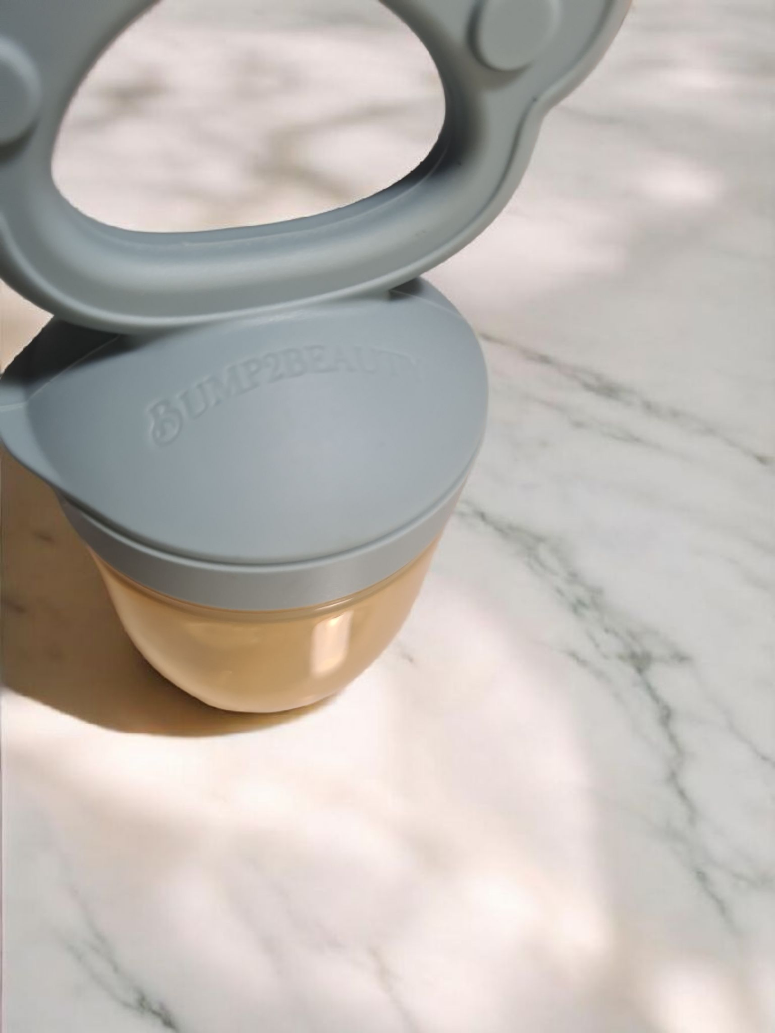 Introducing the Bump2Beauty Pastel Blue Silicone Baby Feeder Pacifier - the perfect solution for introducing solid foods to your baby while reducing the risk of choking. Made of 100% food-grade silicone, this feeder pacifier is soft and gentle on baby's gums, and the ergonomic handle is easy for little hands to hold. Enjoy a hassle-free feeding experience with Bump2Beauty.